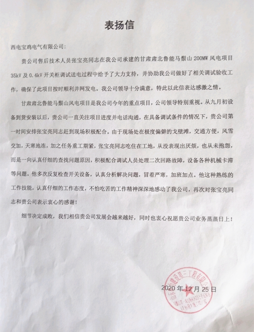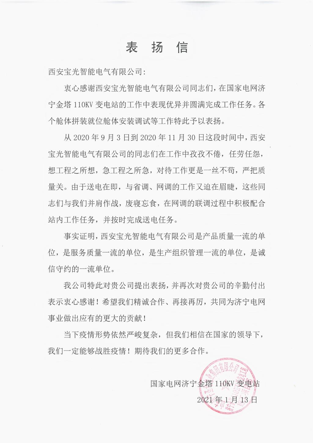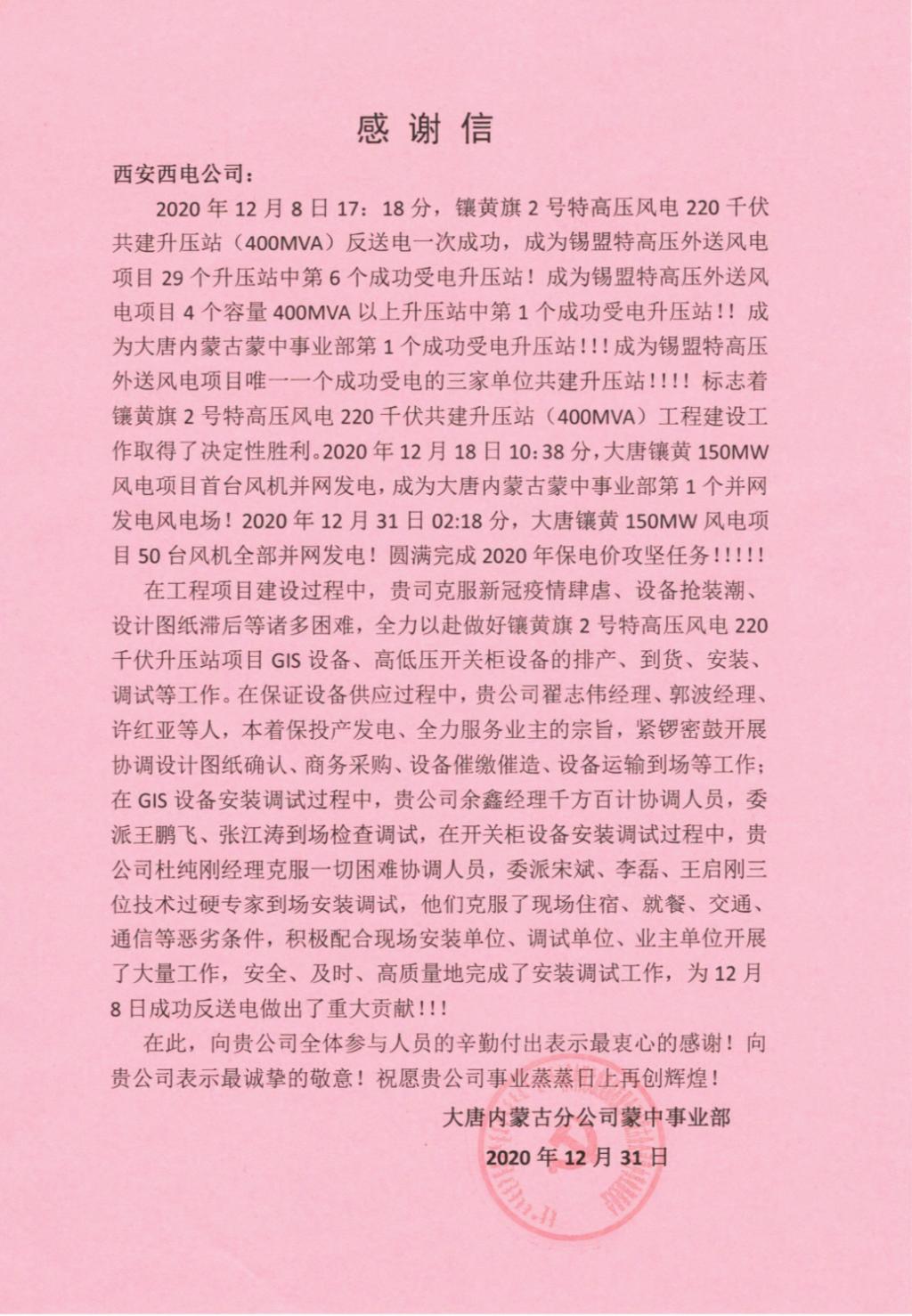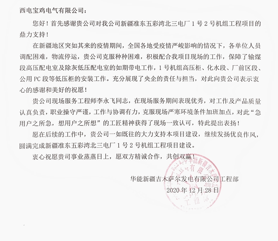 近日,西電寶雞電氣、寶光智能先后收到華能新疆吉木薩爾發(fā)電有限公司、山東電力建設(shè)第三工程有限公司、山東濟(jì)寧圣地電業(yè)集團(tuán)有限公司濟(jì)寧金塔110KV輸變電工程施工項(xiàng)目部、大唐內(nèi)蒙古分公司蒙中事業(yè)部四封感謝信。 四封感謝信都對(duì)西電寶雞電氣、寶光智能“急用戶(hù)所急、想用戶(hù)所想”的工匠精神表示高度認(rèn)可和表?yè)P(yáng);對(duì)公司運(yùn)維服務(wù)工作人員熟練的工作技能,認(rèn)真的工作態(tài)度、不怕吃苦的工作精神表示衷心的感謝;全心全意為工程建成投產(chǎn)提供了重要保障,充分彰顯了央企擔(dān)當(dāng),并希望雙方能夠精誠(chéng)合作,共同創(chuàng)造更多的精品工程。