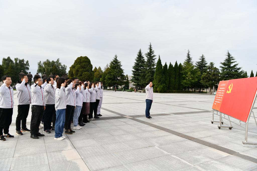 扶眉戰(zhàn)役烈士紀(jì)念碑前,全體黨員在黨支部書記的帶領(lǐng)下,舉起右拳,重溫入黨誓詞,向在扶眉戰(zhàn)役中英勇犧牲的烈士們致以最崇高的敬意。