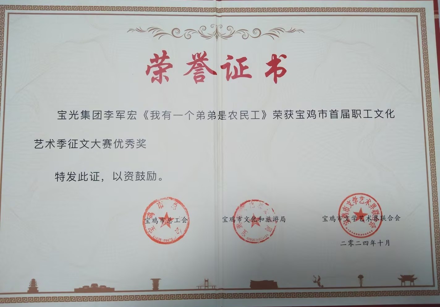 西電寶雞電氣李軍宏榮獲寶雞市職工文化藝術(shù)季征文大賽優(yōu)秀獎(jiǎng)